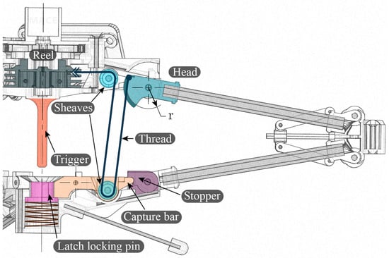 Some examples of common energy release mechanisms found in current jumping robots are overrunning clutches, snail cams, locking mechanisms, and detaching idler gears. In order to meet the sub-kilogram scale and low power consumption goals of the CLOVER robot design, the most suitable approach is to use a locking mechanism. The locking mechanism is a robust, simple, and small size solution for energy release. Figure 7 illustrates the fundamental components of the designed latching mechanism. The figure shows the docking configuration wherein the capture bar is firmly anchored by the stopper and latch locking pin. This configuration enables the operation of the compression mechanism. As the compression of the linkage evolves, the trigger gradually comes near to the latch locking pin, eventually pushing it releasing the capture bar; at that point, the decompression of the linkage starts. The length of the trigger establishes the initial value of . From the previous discussion of the phase portrait of the trajectories of the DM, the length of the trigger must ensure that or if the system is highly damped, that the mechanism reaches sufficient thrust force as to overcome frictional forces in joints. The main advantages of the latching mechanism developed for the analysis presented herein is its simplicity and null friction losses after undocking. Nonetheless this solution enables untethered operation, it is impractical for autonomous application because it requires manual re-docking. For the analysis at hand, i.e., linkage system energy conversion efficiency, this approach is valid.