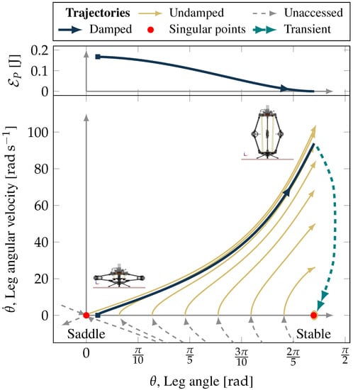 Phase portrait of the trajectories of the dynamical system for the parameters reported in Table 1 and Table 2. The damped trajectory characterising the laboratory demonstrator moves from a high potential energy state located near an unstable singular point, to a low potential energy state during linkage decompression. If the rotational kinetic energy ( converted to ) in the linkage is damped out, then the trajectory of the dynamical model will move towards the stable singular point and remain idle afterwards. Undamped trajectories, i.e., , are shown for reference.