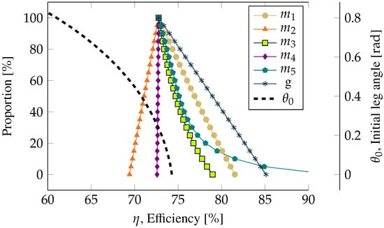 In the first instance, efficiency is mostly influenced by the value of gravity acting against the linear vertical acceleration, ; a reduction in g value prompts an increase in . From the body masses, the foot mass and the upper mass are the most influential; a value increase reduces . Less detrimental variation on is observed for knee mass () increment, which supports the CLOVER knee design approach.