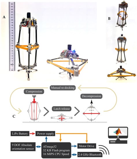 The research protocol started with the wireless connection between the robot and the dongle. The locking mechanism was manually assembled with the robot in idle stand position as shown in Figure 10A. Commands were sent through MATLAB to the robot to test successful communication. With the connection stablished and test commands executed by the robot, a wind command actuated the reel and compression of the linkage started for an experiment. Latch release happened eventually by the self-compression of the linkage ultimately yielding a jump, Figure 10B. With the robot fully decompressed after a jump, manual re-docking prepared the robot for a subsequent jump. An illustration summarising this process is presented in Figure 10C.