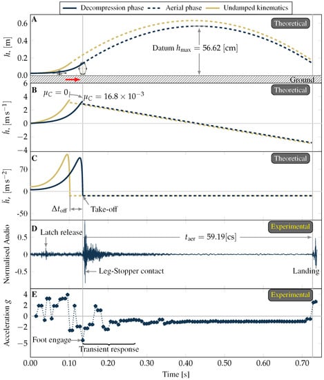 The experimental evolution of the dynamics of the laboratory demonstrator was registered externally by the video camera, and onboard by the 9DOF absolute orientation sensor. The camera captured 240 video frames per second and 44,100 audio samples per second, while the orientation sensor captured 150 samples per second during the jump tests. The time-of-flight characteristic to the vertical jump is a conspicuous phenomenon (Figure 11A–C), which was effectively captured by media (Video available as on-line supplementary material) as well as the onboard orientation sensor as shown in Figure 11D,E respectively. Notwithstanding, higher sampling of the acoustic data provided the best resource for the analysis. This data captured acoustic signatures related to well-known sequential stages in the experiment. In the recorded sequence shown in Figure 11D, the first sound spike as seen from left to right, was caused by the latch release marking the start of the jump development. The next major sound transition in the sequence captured the foot engage marking the start of the aerial phase. Subsequently, a high amplitude sound spike produced by the leg-stopper contact (diagram in Figure 7), was followed by a decreasing muffled sound evincing the transient dynamical response of the CLOVER robot. The final recorded sound spike demarcated the end of the aerial phase at robot-floor contact. Therefore, the characteristic time of the take-off phase of the vertical jump was 95 , and the characteristic time lapse between foot engagement and landing floor contact, i.e., the time-of-flight, was 592 with standard deviation of 59.7 from ten observations.