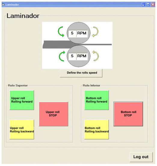 The asymmetric rolling mill used in this work is a homemade machine constructed at the Mechanical Engineering Department of the University of Aveiro, Portugal. Asymmetry is imposed by the difference between the rotational speed of the upper roll and that of the bottom roll. Each roll is connected to one gear motor with 2.2 kW and variable-frequency drive, which permits a variation of the speed between 0 and 15 RPM (rotation per minute). The interface that controls the roll’s speed was made using Melsec Medoc, Visual Basic, and ActiveX software. The two rolls have an equal diameter of 180 mm and a width of 300 mm. For accurate control of the sheet thickness, a level comparator (Mitutoyo, Japan) is mounted on each side of the mill. Figure 1 shows the rolling mill, and Figure 2 shows the user-friendly interface.