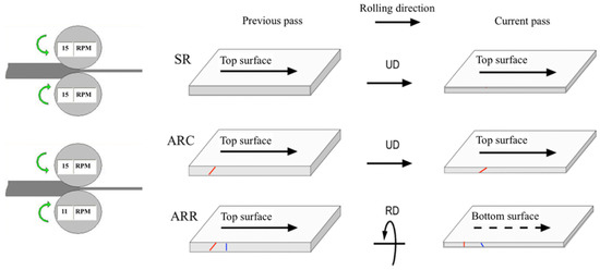 Rolling routes employed in the present work. SR—symmetric rolling; ARC—continuous asymmetric rolling (no rotation of the sheet between two subsequent passes); ARR—reverse asymmetric rolling (rotation around the rolling direction between two subsequent passes).