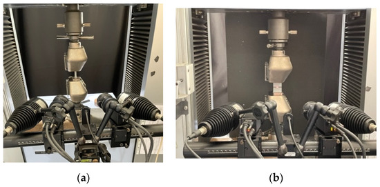 A uniaxial tensile test, plane strain test, and disk compression test were performed using a Shimadzu AG-X universal tensile test machine (Japan) with a load capacity of 100 kN. The geometry of the samples is presented in Figure 4. The samples were cut from the rolled sheet by a cutting press machine and machined by CNC. For the tensile test, the samples tested in one direction were cut from the same sheet. In the case of the plane strain test, only one sample per rolled sheet was obtained. The disk compression samples were cut from the remaining material of these sheets by electroerosion. A schematic representation of the relative position of the tensile test specimen on the rolled sheet is presented in Figure 4c. The strain was measured by an image correlation system and Aramis 5 M software (GOM, Germany). The testing setup is shown in Figure 5. For the determination of the experimental points included in forming limit diagram (FLC) the regulation given in ISO 12004-2:2008 was used.