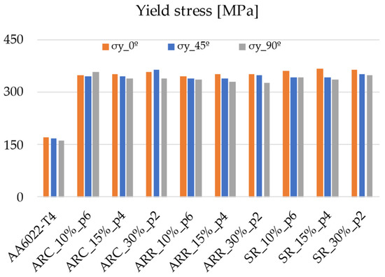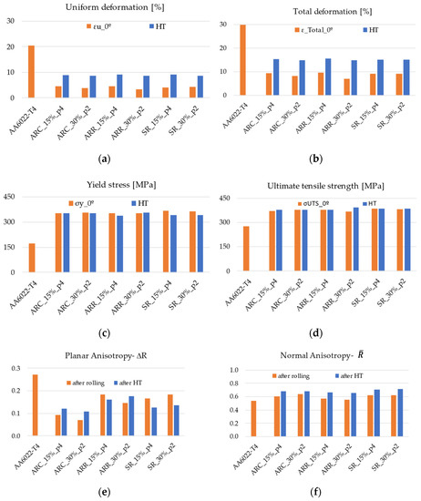 Heat treatments (HT) in the range of 150–250 °C and 15–60 min were applied to the material after rolling to increase the formability. Temperatures below 200 °C are beneficial, leading to a small decrease in stress with increased strain. For temperatures above 200 °C, the stress decreases by about 100 MPa, and, unexpectedly, deformation also decreases. It seems that for this condition, the material reaches the overaged conditions. A study by Gracio et al. [23] regarding the artificial aging of AA6022 indicates that temperatures in the range of 240–260 °C for 10–20 min led to the peak age condition. In the present work, with temperatures of 250 °C/15 min, we obtained the overaged condition, possibly as a result of acceleration of the kinetics of the precipitates due to cold deformation, as detected by Yassar et al. [24] in the same aluminum alloy. Of the tested temperatures, the combination of 150 °C/45 min, 175 °C/30 min, and 175 °C/45 min seems to be the best choice. The variation in strain under these annealing conditions is up to 1%, and the variation in stress is up to 15 MPa. Annealing increases both types of anisotropy, leading to an improvement compared to the initial material, as shown in Figure 13e,f. The effect of recovery at 175 °C for 45 min for samples cut in the RD is summarized in Figure 13.