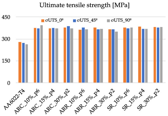 The yield stress increases considerably as a result of rolling, as shown in Figure 6. A very small difference is observed between the rolling routes, with the lowest value corresponding to ARR. Regarding the evolution of yield stress of the in-plane anisotropy (at 0°, 45°, and 90° from the rolling direction), the highest values were achieved in the rolling direction (RD, 0°) although they were very close to the values obtained in the transverse direction (TD, 90°) and the diagonal direction (DD, 45°). Considering an average value of yield stress after rolling within all routes, there was an increase of 107 % compared to the as-received material. The ultimate tensile strength (UTS) follows the same trends but with a smaller increase, as shown in Figure 7. The increase in UTS is about 38%. This is due to the reduction in the strain-hardening rate of the rolled material in comparison with the hardening rate of the initial material.