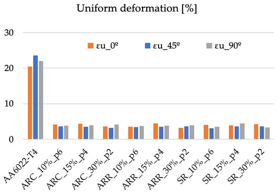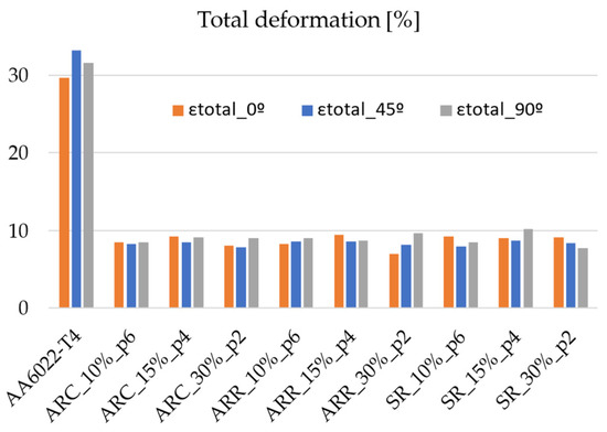 During the rolling process, the material accumulated a large amount of strain, which led to a considerable increase in stress, as previously observed. Thus, the material is expected to exhibit low performance in terms of deformation. Figure 8 shows a summary of uniform deformation for all rolling routes. Initially, the material shows the best formability/ductility for 45° from the rolling direction, whereas after rolling, this direction shows the lowest values of uniform deformation for most of the cases. The differences are very small within all three directions (less than 1% strain). Thus, when applying the same strategy as in the case of stress and calculating the decrease in strain, a reduction of 83% is observed in uniform deformation. The trends are similar for total deformation, with a decrease of about 73%. The results are shown in Figure 9.