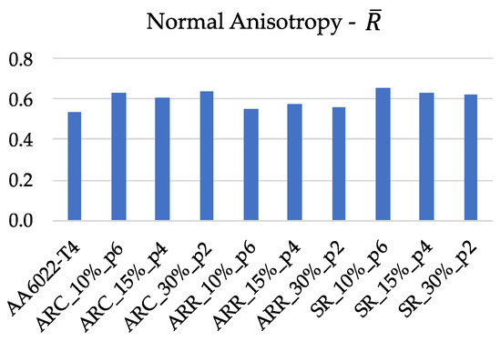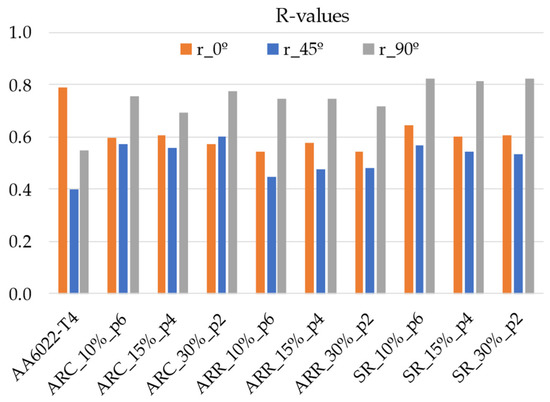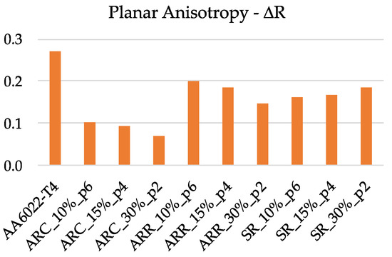 As presented in the Introduction, several authors suggest that ASR is capable of improving the plastic anisotropy of material, i.e., the normal anisotropy increases, whereas the planar anisotropy decreases. The Lankford coefficient was measured at the end of each type of rolling in three directions, namely 0°, 45°, and 90°. A summary of the results is presented in Figure 10. The initial material presents the highest R values for 0°, with a minimum at 45°. After rolling, the minimum R values remain at 45°, whereas the maximum values increase to 90°. This evolution of R values is observed for all rolling routes except one, i.e., ARC with 30 reductions per pass in two passes. In this case, the minimum occurs at 0°. Such behavior of the Lankford coefficient is related to the texture evolution during the rolling process. The texture evolution is beyond the scope of this work, in which anisotropy is analyzed from a macroscopic point of view. Using the Lankford coefficients, the average value of normal anisotropy ( value) and the planar anisotropy (ΔR) were calculated for all rolling routes. These results are presented in Figure 11 and Figure 12, respectively. The lowest value of corresponds to ARR routes, resulting in materials similar characteristics to those of the as-received material. For ARC and SR, a small increase in -value is obtained. The planar anisotropy shows a drop for all rolling routes, with the minimum corresponding to ARC. In addition, it seems that the planar anisotropy is also related to the number of passes and the thickness reduction per pass used in each rolling route, showing the same trend for ARC and ARR (i.e., ΔR decreases with the reduction in pass number) and an opposite trend for SR (i.e., ΔR increases with the reduction in pass number). For sheet-metal-forming applications, it seems that the best rolling route is ARC, as it is capable of producing a material with the lowest ΔR and highest value.