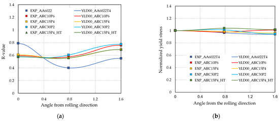 Figure 14 shows the evolution of the anisotropy factor (a) and of the yield stress (b) as a function of the tensile loading axis between 0° and 90°. The anisotropic yield criterion (Yld2000-2d) characterizes very well the initial plastic anisotropy of the studied AA6022-T4-T4 sheet, as expressed by the yield stresses and R values. The predicted normalized yield stresses and anisotropy factors accurately reproduce the experimental values and their entire distribution. An excellent match between the experimental points represented by markers and the predicted curves is observed. A decrease in R values for RD and an increase in R values for DD and TD of approximately the same amount (0.2) were observed.