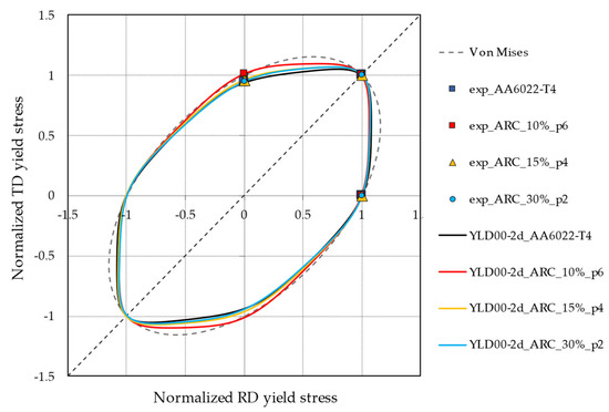 The plane stress yield surfaces of the AA6022-T4-T4 sheet are presented in Figure 15. The balanced biaxial yield stress used as input in the Yld2000-2d coefficient, assures a great accuracy in reproducibility of the yield surface in the critical region of biaxial stretching. The effect of ARC on the yield surface is observed in DD and TD through the normalized values of σ45 and σ90.