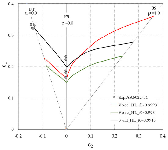 Figure 16 shows the experimental forming limits for the AA6022-T4-T4 sheet under proportional loading, as well as those simulated with the selected constitutive equations, namely the Yld2000-2d yield function with the Voce hardening law and the Swift hardening law. To achieve the agreement with the experimental data, the initial value of the M–K geometric defect of 0.9945 and the material strain hardening described by the Swift hardening law were adopted throughout this investigation. The forming limits predicted using the Voce hardening law are underestimated for an f0 of 0.998, an appropriate value for FCC materials, as suggested by Barlat [26]. An f0 of 0.9998, chosen to increase the predicted values, results in an under evaluation of the left-hand side of the FLD, whereas the right-hand side is substantially overpredicted. The choice of Swift hardening law corroborates a study by Haque and Yoon [25], who found that the Swift law fits better than Voce law for the hardening of the AA6022-T4-T4 sheet. The strain paths are characterized by the stress ratio (α), expressed as σ2/σ1, and by the strain ratio (ρ), expressed as dε2/dε1, respectively. The acronyms UT, PS, and BS are used for uniaxial tension, plane strain, and biaxial stretching, respectively.