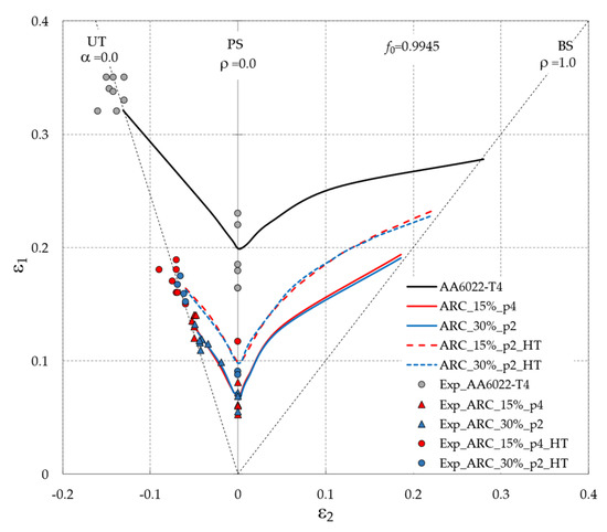 Due to the similar results in terms of deformation, FLD prediction was studied only for the ARC route. The effect of ARC on the FLD of the AA6022-T4 sheet is analyzed by comparing the FLD of the original AA6022-T4 sheet with that obtained after applying ARC conditions, namely ARC_15%_p4 and ARC_30%_p2. These results are shown in Figure 17.