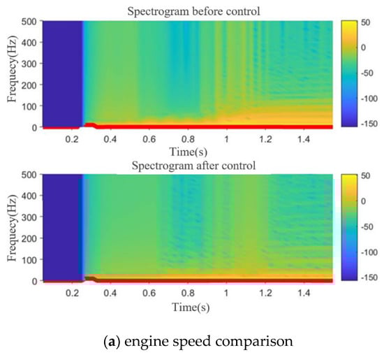 Except from the perspective of time domain, the performance of the controller can also be measured from the perspective of frequency domain. Fourier transform is performed on the rotation speeds of the engine and the motor to obtain a spectrum, as shown in Figure 16. In the figure, the x axis is time, and the y axis and the color bar represent frequency. The larger the value of the y axis is, and the closer the color is to blue, the more this indicates that the fluctuation amplitude of the rotating speed is smaller. On the contrary, the smaller the value of the y axis and the closer color is to red, the more this indicates that the fluctuation in the rotating speed is more severe. Through the observation of comparison charts for the A and B groups, it can be seen that the engine speed after 0.8 s control is closer to the blue range, which indicates that the controller can effectively control the engine speed fluctuation in the speed synchronization stage and the full participation stage. The blue range of the motor speed spectrum is larger after 0.3 s control, and in particular, the torsional vibration attenuation at the motor is more obvious in the speed synchronization stage after the engine is increased to idle speed. The results show that the designed model reference adaptive controller can effectively improve the ride comfort of the vehicle transmission system in the process of mode switching.