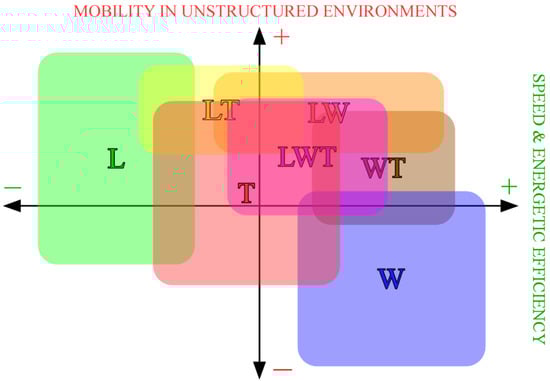In the rest of the paper, the investigation will be limited to the mechanical aspects. With regard to these, in a nutshell, wheeled robots maximize speed and energetic efficiency, while legged robots have superior mobility in unstructured environments; tracked robots are somewhere in the middle, and are particularly suitable for moving on soft and yielding terrains, thanks to the large contact area with the ground. A very synthetic and qualitative outline of the locomotion systems’ features is represented in the chart of Figure 1 [], where the vertical axis represents the mobility in unstructured environments, and the horizontal axis represents speed and energetic efficiency. Indicatively, L, T, and W systems are diagonally placed in the graph, with mobility in unstructured environments inversely proportional to speed and energetic efficiency, while hybrid combinations aim at filling the right upper zone, with a combination of the benefits, although limited by the increase of mechanical complexity that usually implies performance compromises.