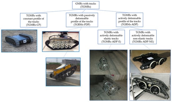 Considering the second taxonomy (Figure 5), the track profile can be constant (TGMRs-CP), passively deformable (TGMRs-PDP), or actively deformable (TGMRs-ADP). TGMRs-CP are the most widespread for their simplicity, especially for small-scale realizations in which the structural resistance is less critical []. On the other hand, TGMRs-PDP are frequently larger, with passive suspension systems to filter impacts with obstacles and irregularities and to improve traction []. TGMRs-ADP solutions usually enable the switch from wheeled to tracked locomotion [,].