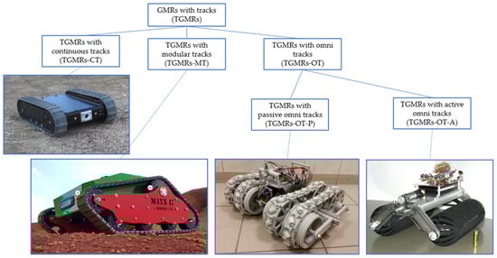 The present paper is focused exclusively on the locomotion systems of TGMRs, independently of the rest of the robot body, which can have very different functions and levels of complexity, from simple transport of environmental sensors and cameras [,] to manipulation with dexterous anthropomorphic arms and hands [], and providing locomotion ability to disabled people [].