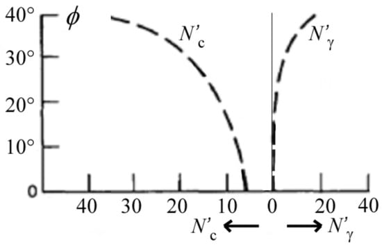 where: c is the terrain cohesion [Pa]; γs is the specific weight of the terrain [N/m3], N′c and N′γ are the Terzaghi’s modified bearing capacity factors, which are functions of the internal friction angle of the terrain ϕ according to the empirical relationships represented in Figure 8; the angle ϕ′ can be obtained by the following formula []: