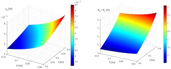 Track sinkage (z0, (left) [m]) and sum of compaction and bulldozing resistances (Rb + Rc, (right) [N]) as function of the track width b [m] and length l [m].
