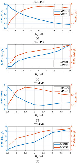 Figure 11 shows the variations of several variables according to those of Kγ and Kq for PPM-RYR, STL-RYR, and PATH-RYR under the condition that η of Equation (14) is 1.0. Figure 11a,b show the variations of the measures for PPM-RYR. As shown in Figure 11a, Kγ should be larger than 5.5 so that MALOE is less than 1.6 m for path tracking. However, as shown in Figure 11b, Kγ should be larger than 3.0 so that MASSA is smaller than 2 deg for lateral stability. Therefore, there is clear conflict between path tracking and lateral stability. This fact is also true for STL-RYR. In the case of STL-RYR, Kγ should be larger than 1.4 for path tracking and smaller than 0.8 for lateral stability, as shown in Figure 11c,d. In the case of PATH-RYR, Kq should be larger than 0.52 and smaller than 1.1 for path tracking, and smaller than 0.52 for lateral stability (Figure 11e,f). These results represent the fact that there are no overlapped regions between path tracking and lateral stability for Kγ and Kq. Because of the clear conflict between path tracking and lateral stability, it is desirable to adopt a switching scheme with respect to a certain variable between those objectives [45,48]. It should be noted that these results were obtained under the condition that η of (14) is 1.0.