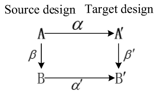 With analogy, similarity in specific characteristics for two processes or designs are identified to cast forward the successful design concept/technique of one process or design to the design of the other. Analogy design is an effective innovation method to apply analogy reasoning in product design [14]. Classic analogy design concept is indicated in Figure 1. It uses an existing successful scheme as design source and required design as design target to identify their similarity to avail design solution [15,16]. Assuming that initial and final states of source design are and in Figure 1, initial and final states of target design are and , respectively. There are relations of and between initial and final states, that is, generates through and generates through . At the same time, there is a certain similarity between and , and thus is adaptive for . In target design, ideal design can be obtained according to and with reference to similarity between and .
