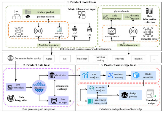 Digital twin is the virtual representation of physical objects, such as various manufacturing resources [21]. It has been extensively applied in industrial designs to avail comparatively tangible design. Specifically, Tao et al. [22,23] proposed a 5D model of digital twinning for information and physics system integration, information physics data fusion, and virtual–real bidirectional connection and interaction. Wu et al. [24] proposed a conceptual modeling method for intelligent vehicles based on 5D digital twin model and created a conceptual intelligent vehicle design. To continuously improve products design model and physical product, 3D experience platform based on DT was built for user interactive feedback information [25]. To collect and execute big data for system optimization and reconfiguration, a remanufacturing collaboration model was combined with communication ability and a fine perception control function using DT [26]. DT with ontology was applied to capture the diversity and quantity of data in a complex engineering system [27]. DTs have also been used for product innovation and redesign [28,29]. Inspired by these studies, some enterprises wish to build their own digital twin knowledge base for information relating to their existing products. The information is then used in design process of new products. A conceptual model for establishing a digital twin knowledge base is shown in Figure 3.