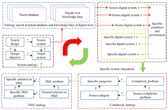 This study proposes a method to improve innovative design feasibility by integrating digital twin and analogy. Combining analogy through DCC, TRIZ, and knowledge base of digital twin, a multi-analogy innovative design framework is constructed, as illustrated in Figure 5.
