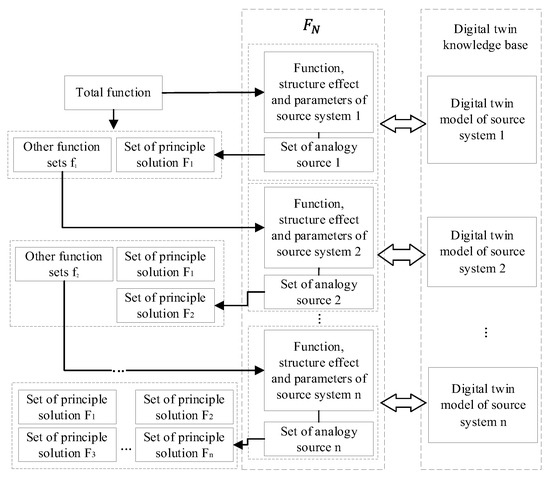 According to the results of Step 2, the process calls the knowledge base of the digital twin and retrieves the corresponding digital system after the retrieval model is formed according to the functional principle. The retrieval process is shown in Figure 7. Source system should exhibit functions that are most similar to total function of target system, its function set are retrieved from library. Gap between target system and source system, i.e., function set , is specified. Process then retrieves source system similar to to construct and searches gap between and to specify until all analog source systems are explored. It is desirable that all similar functions and their corresponding systems in source database are identified. For instance if some functions cannot be found due to insufficiency of the database, all the similar functions should be searched