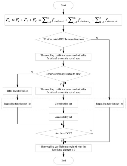 All functions of the new product are composed of function sets , and . However, is not a simple linear addition of these function sets. Both interactions between new and old functions should be considered. Accordingly, Equation (6) is reformulated as follows,