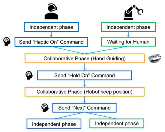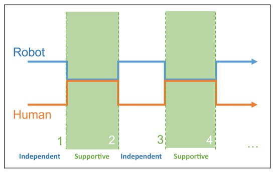 Figure 1 schematically represents the process by highlighting the alternating switch between two different phases, namely independent and supportive phases. During the independent phases, the robot and the operator work in a coexistence scenario, operating on different workpieces and processes. As soon as the operator needs the robot’s assistance, the supportive phase can be enabled: the operator and robot work on the same workpiece interactively, and the robot must behave according to human intentions. This requires the robot to be warned of human intention in advance through a command message [
