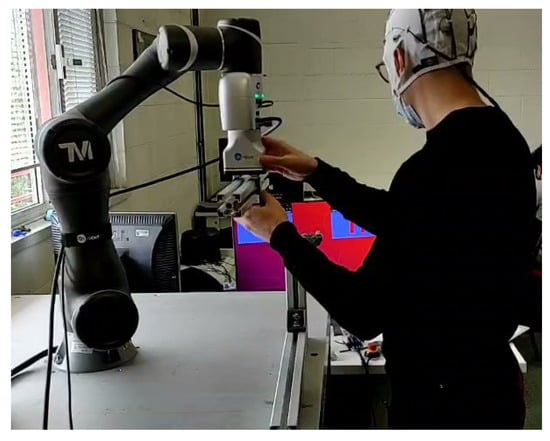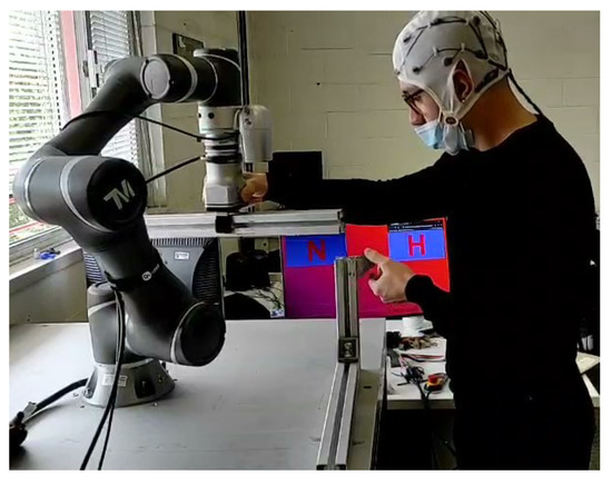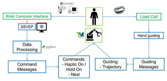 Figure 2 shows the framework proposed, in which the operator can interact with the robot manipulator through two different interfaces. The activities related to the Brain–Computer Interface are described on the left side of the figure, whereas those related to load cell and haptic control are reported on the right side of the scheme. Looking at the left-hand side of the scheme in