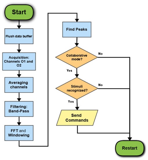 The SSVEP frequency recognition software, and its integration with the robotic workflow described in the previous section, have been specifically developed. The algorithm flow is shown in