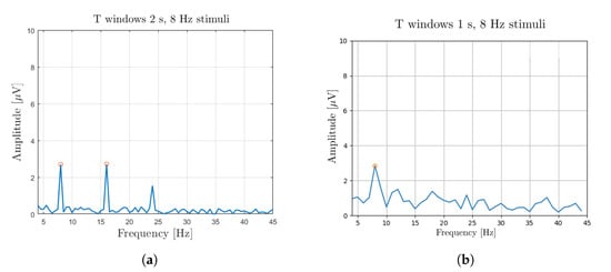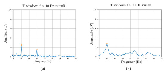 Figure 7b, respectively. For all the considered cases, it is possible to detect the main frequency of the stimulus, with the first multiple frequencies also visible in the case of higher spectral resolution.