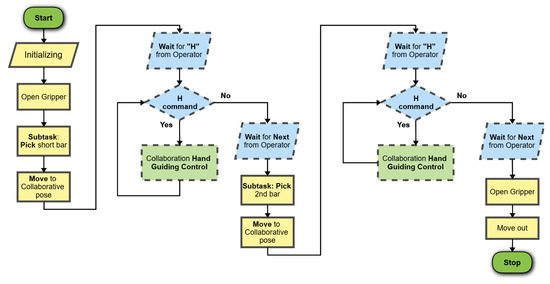 Right after the start block, initialization actions and variable setting take place. The subtasks to be executed in independent mode are then carried out (i.e., Open Gripper, Pick bar Subtask, Move to handing pose where to wait for the operator). When the independent phase is over, the cobot is ready for entering the cooperative mode, it activates the “cooperative flag” enabling the possibility to receive the BCI command “H” from the operator. Then it waits for the operator’s command: measurements from the BCI device and results from data analysis start being taken into account by the robot controller. SSVEP frequencies gathered from the BCI headset are compared with the pre-set frequencies to recognize the operator’s choice. The program makes a step forward when the frequency corresponding to the H signal is detected.