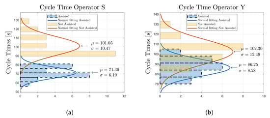Figure 12a,b show the distributions of the cycle times corresponding to the two operators, S and Y, respectively. In each figure, the cycle times related to the manual assembly (labeled with