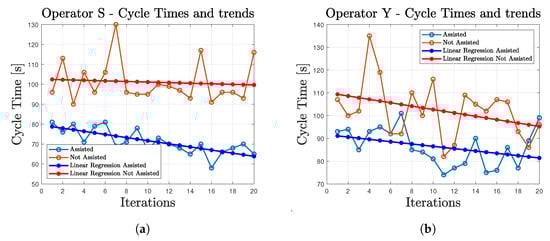 Figure 12, reported this time in sequential order, as gathered during the execution of the test series. A learning effect is visible in all the series of tests, with a reduction of the cycle time occurring when the number of repetitions of the task increases, due to the fact that the operators improve their skills during the activity. The linear regression lines plotted in the figures can be used to estimate the learning rate of each operator. The linear regression slopes in the assisted cases show a reduction of the cycle time for both the operators (