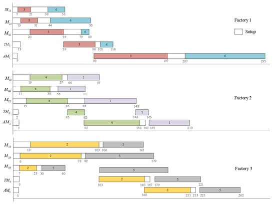 An illustrative example with six products (), three factories () and three machines () at the fabrication stage of each factory is shown in Table 2. For factory set , product i can be produced by the factory in , , , , , , . “—” For example, in , product 1 cannot be assigned to factories 1 and 3, then , , and so on. A Gantt chart of a schedule of the example is shown in Figure 1, , , , , , , total tardiness of factory 1, 2, and 3 is 37, 6, 34, respectively, and the corresponding is 77.