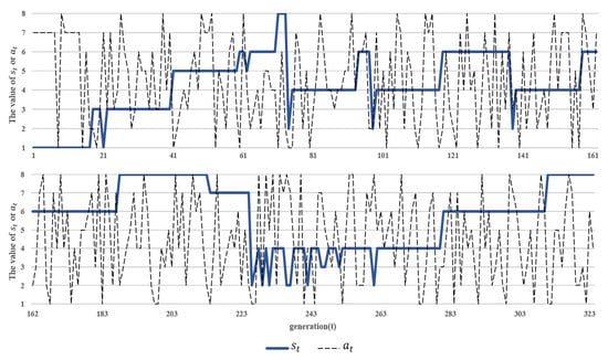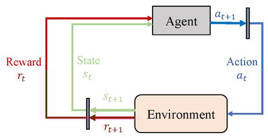 The Q-learning algorithm [] is the most commonly used model-free RL algorithm. It provides a learning capability for the intelligence system in the Markov environment to select the optimal action using the experienced action. The main components of Q-learning include a learning agent, an environment, states, actions, and rewards. The illustration plot is shown in Figure 2. The Q-learning algorithm has a simple structure and is implemented easily. It has been successfully integrated with meta-heuristics such as GA, CS and QHH for production scheduling [,,]. Its simplest form is defined by