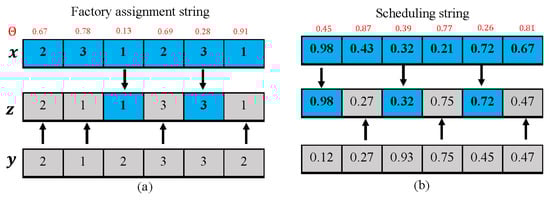 Because the problem has two sub-problems, a two-string representation is used, in which a solution is denoted by a factory assignment string , , ⋯, and a scheduling string , , ⋯, , where factory is allocated for product i, and is a real number in and corresponds to product i.