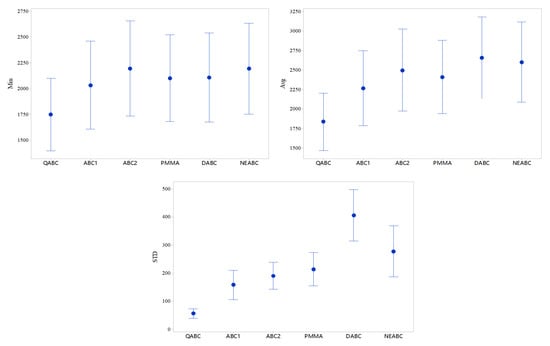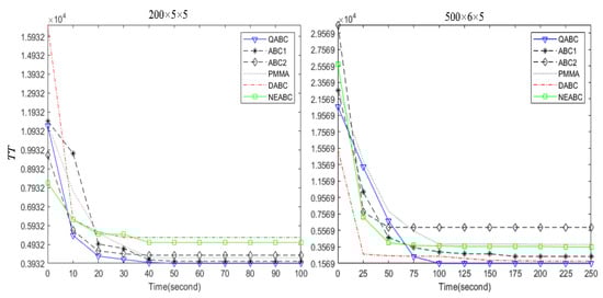 When QABC is compared with DABC, it can be seen from Table 6, Table 7 and Table 8 that QABC has smaller than DABC in 80 instances, generates smaller than DABC in 85 instances and obtains smaller than DABC in 85 instances; moreover, performance differences between QABC and DABC increase with an increase in . The convergent curves in Figure 12 and results in Table 9 can also demonstrate the performance difference in between QABC and DABC, the performance differences in also can be validated by the statistical results in Table 9, and Figure 11 and Table 9 show that QABC significantly outperforms DABC in .