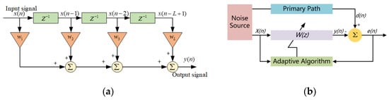 Here, X(n) is the reference input signal obtained by the microphone acquiring the noise source, which can be expressed as X(n) = [x(n), x(n−1), …, x(n − L + 1)]T. The weighting coefficient vector is expressed as W(n) = [w1(n), w2(n), …, wL(n)]T.