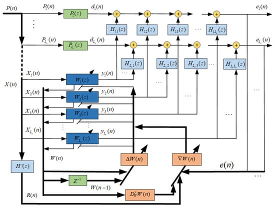where is the expected signal, generated by the primary sound source shown in Figure 2 through primary path response , is the vector of L-order control filter coefficients, and is the L × Le matrix of the filtered-x signal, formed by filtering reference input signal through response model H′(z):