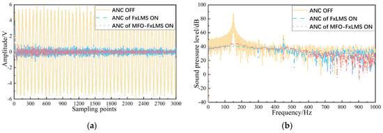 The noise cancellation effects of the FxLMS ANC and the fractional-order ANC algorithms (MFO-FxLMS is the fractional-order algorithm in Figure 4) were compared. The results before and after the control are shown in Figure 4a, and the frequency spectrum is shown in Figure 4b. It can be seen that both algorithms can quickly and effectively suppress noise below 1000 Hz, but the fractional-order ANC had a more effective noise reduction process and the noise reduction effect was better than that of the FxLMS ANC algorithm.