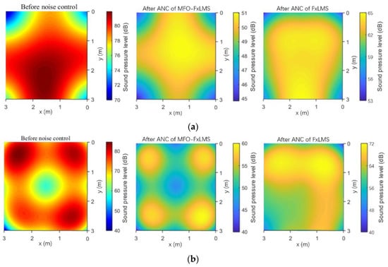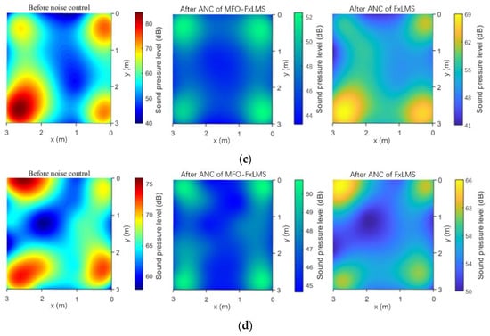 According to the information of the color map in Figure 5a, the average noise in this target area was approximately 77 dB, and the highest noise peak was approximately 82 dB. After the noise control of the fractional-order ANC algorithm, the noise in the entire area was significantly reduced, and the average residual noise was approximately 50 dB. In contrast, by the noise control of the FxLMS ANC algorithm, the area of noise reduction was relatively small, the effect of noise reduction was slightly weaker, and the average residual noise was approximately 63 dB. Overall, the noise was reduced by approximately 27 dB through the fractional-order ANC algorithm and 14 dB through the FxLMS ANC algorithm.