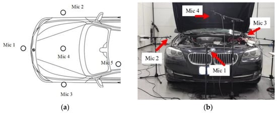 Experimental arrangement of vehicle engine noise measurement: (a) Microphone arrangement; (b) Experimental apparatus arrangement.