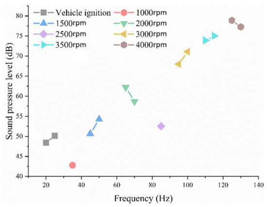 The experiment involved collecting and analyzing vehicle engine noise in an anechoic chamber. The noise signals were collected using the microphones (Named Mic 1–5 for convenience) and transmitted to the computer for processing. Microphones were arranged in front of, on either side of, and above the vehicle’s engine compartment and at the headrest of the vehicles seat (Figure 6). The vehicle was started and ran stably at different speeds, and the signal noise data were recorded in real time. The peak frequency of the vehicle engine noise fluctuated within 20–150 Hz (Figure 7).