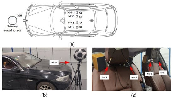 The experiment layout is shown in Figure 9a. There were four desired signal sensors and one reference signal sensor. The reference sensor was placed in the engine compartment of the vehicle, whereas the desired signal sensors were placed at the four seat headrests. The primary sound source was a high-power omnidirectional loudspeaker placed at approximately 10 cm from the front of the vehicle. A reference microphone was placed at 5 cm from the front of the spherical power amplifier to collect the sound source signal (Figure 9b). The error microphones were placed at four measurement points in the vehicle (M1–M4). To ensure that the distance between each control area and the noise source was consistent and the sound field was similar, an error microphone and secondary sound source speaker were placed 10 cm away from each other at the headrests of the driving and copilot seats (Figure 9c).