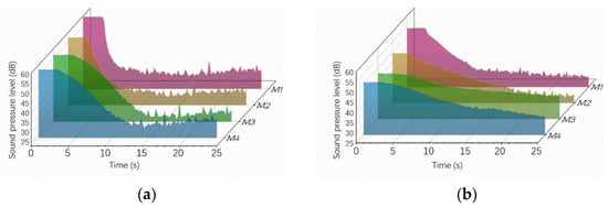 Variation curve of the sound pressure level of the noise: (a) 200 Hz single-frequency; (b) 150 Hz, 250 Hz, and 400 Hz mixed-frequency.