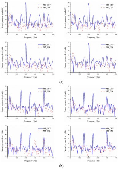 Noise spectrum of the target area before and after 4-channel fractional-order active noise control: (a) 200 Hz single-frequency; (b) 150 Hz, 250 Hz, and 400 Hz mixed-frequency.