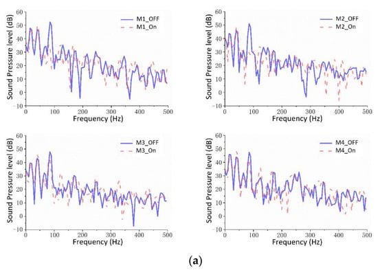 As shown in Figure 13, because the vehicle engine noise changed with the speed, corresponding to a certain frequency, after the multi-channel fractional-order ANC algorithm was turned on, the amplitude at the peak frequency of the engine noise was significantly reduced by more than 10 dB, and the total noise cancellation was reduced by approximately 4.7 dB on average (Table 4). Most of the noise below 50 Hz was generated by the resonance of the vehicle body structure and should be optimized from the perspective of vibration reduction. Overall, it was demonstrated that the multi-channel fractional-order ANC algorithm is capable of effectively reducing the engine noise in the target area and expanding the silent zone.
