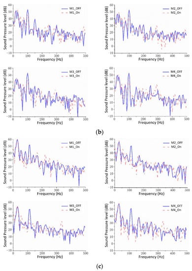 The experimental results showed that the algorithm led to an average noise cancellation of nearly 22 dB for single-frequency noise below 400 Hz. The highest noise reduction reached 28 dB. The noise cancellation for the mixed frequency noise source was not as great as for the single frequency source because of the increase of the signal complexity, but the average noise cancellation reached 17 dB. After the ANC was turned on, the sound pressure level of the noise was immediately reduced, finally reaching a stable state at approximately 30 dB. The frequency spectrum in Figure 11 shows that the sound pressure level of the noise at the frequency where the noise was the main contribution was greatly reduced after the algorithm was turned on, whereas the sound pressure levels at other frequencies did not show large improvement.